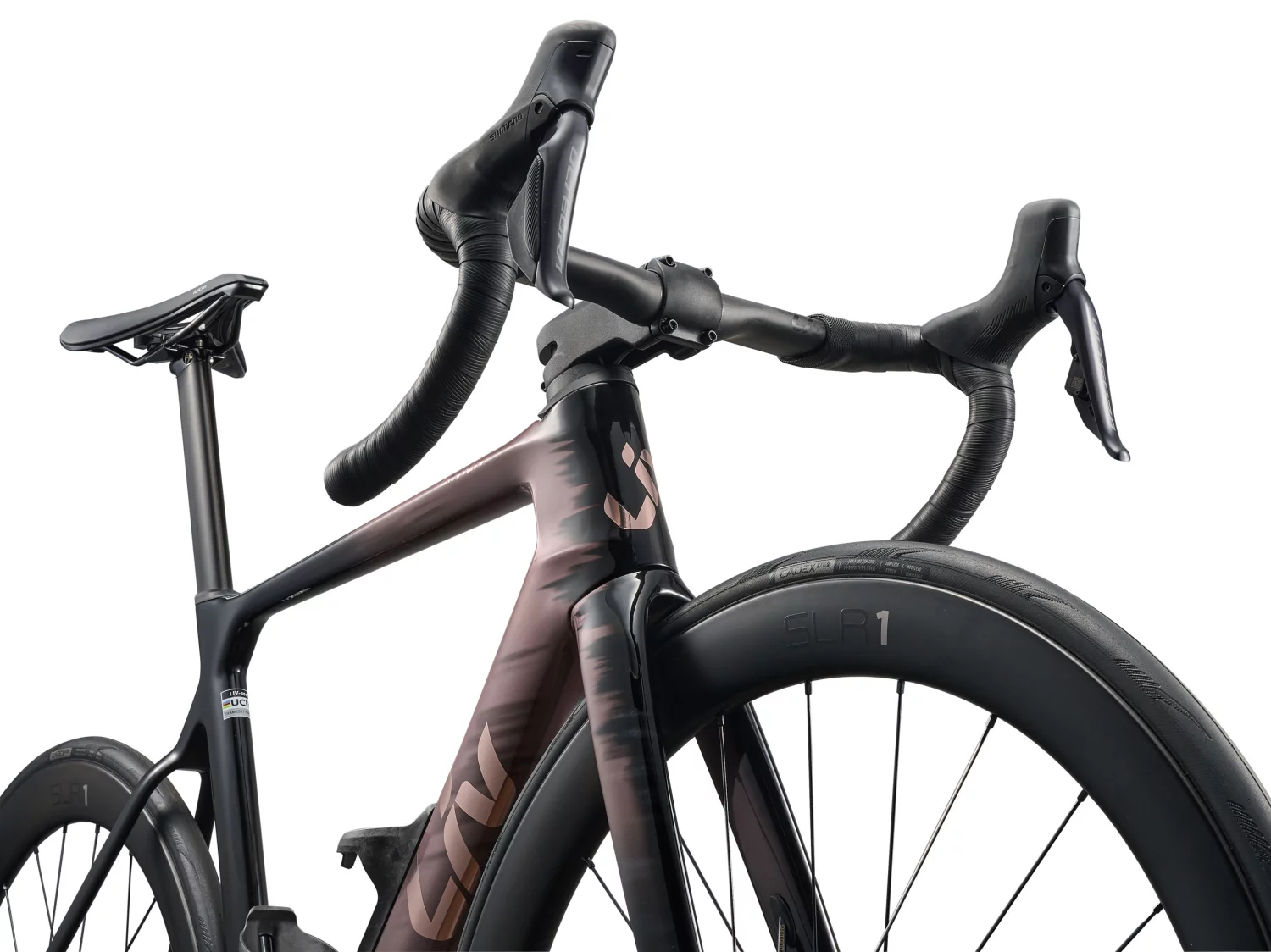 The frame is made of Advanced Composite carbon and the fork is made of the higher-end Advanced SL Composite (including the seatpost) . Liv states for this seriesa saving of 205 grams compared to the previous generation EnviLiv Advanced Pro. Aerodynamics are supported by tube profiles in the shape of a shortened ellipse and the Contact SLR Aero cockpit with flattened tops and deeper arches, which, in addition to lower drag, also adds better handling at high speed.