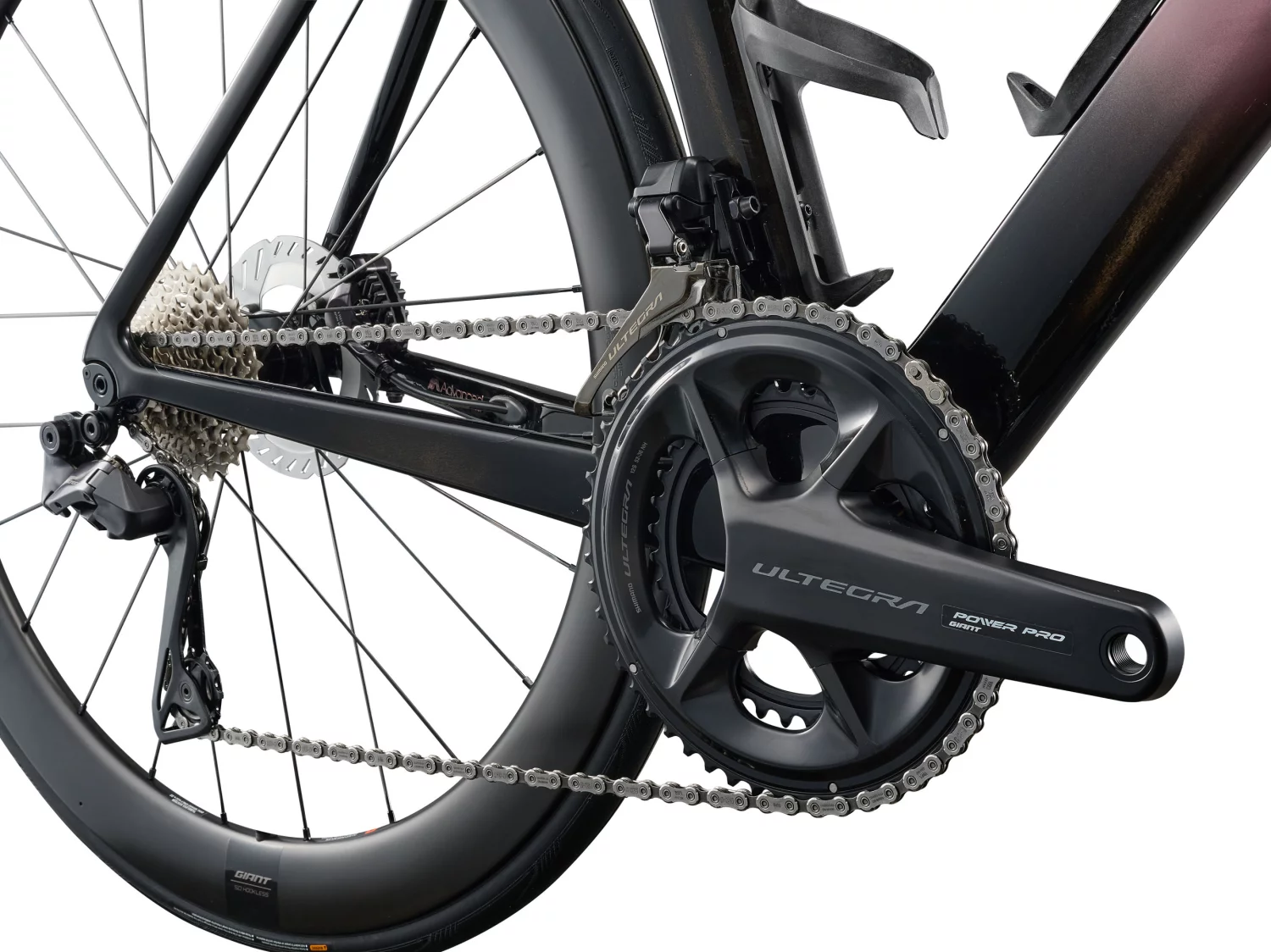 The equipment is purely racing. The shifting is Shimano Ultegra Di2 , the brakes are hydraulic Shimano Ultegra with 160 mm discs in the front and 140 mm in the rear , the cassette is 12-speed 11 to 30. The Shimano Ultegra 36 52 cranks have an integrated Giant Power Pro wattmeter, so you have power undercontrol during training and racing. Aero pace is ensured by Giant SLR 1 50 carbon wheels with a 50mm profile and CADEX Road Race GC 700x28 tubeless tires.